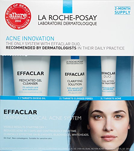The La Roche-Posay Acne Treatment System contains a variety of ingredients that are used by dermatologists to observe the main causes of acne. The system includes Effaclar drug gel facial wash (3.4 fl. oz.), Effaclar clear solution facial toner (3.4 fl.Oz.), Effaclar Duo acne treatment (0.7 F.Oz.).